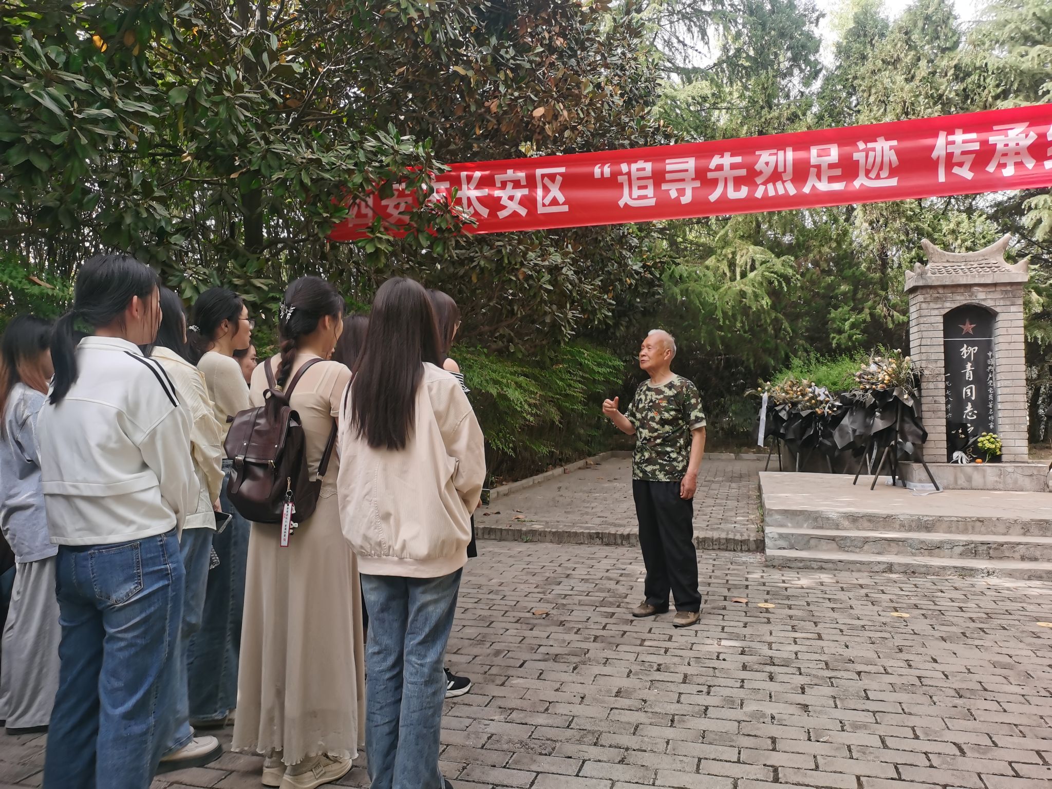 研学最后一站是柳青墓园,为同学们讲解的是柳青笔下《创业史》中“才娃”的人物原型刘田民老人。精神矍铄的八旬老人操着一口陕西话,开口“俺柳青伯”,闭口“俺柳青伯”,将柳青对路遥的知遇之恩、对党和人民的忠诚无私、艰辛又不凡生活经历娓娓道来,情到深处,说者泪目,听者感动。当历史亲历者跨越时间的经纬追忆当年,当书中人物原型出现在眼前,柳青其人其文不再是书上遥远的光环与符号,而是变得清晰可感、真实鲜活。