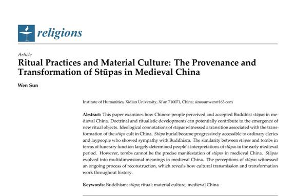 (通讯员 马婧)近日,国际宗教学研究著名期刊Religions(A&HCI, Impact factor 0.8, Citescore 1.1, Journal Rank:Q1 Religious Studies)发表永利集团88304中文系孙雯老师论文“Ritual Practices and Material Culture: The Provenance and Transformation of Stūpas in Medieval China”(《仪式实践与物质文化:中古中国佛塔的缘起与演变》)。