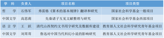 其中石伟军“弗雷格《算术的基本规律》翻译和研究”获批国家社会科学基金一般项目,高思莉“先秦诸子互见文献整理与研究”获批国家社会科学基金西部项目,王跃“清代山西契约文书用字研究及数据库建设”获批教育部人文社会科学研究青年基金项目,刘茸茸“鲁迅对中国当代科幻小说的影响研究”获批教育部人文社会科学研究青年基金项目。