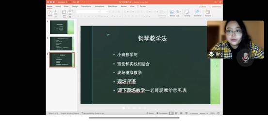 随后,第二位主讲人魏羚与同学们分享美国钢琴专业教学心得,以堪萨斯大学钢琴表演专业为例,魏羚详细介绍了与钢琴专业相关的基础课程,例如钢琴文献学、钢琴教学法、钢琴研讨课、西方音乐史、音乐理论学等。她认为这些课程设置和教学方法能培养学生自主学习的能力,在研讨和学术交流中不断提升自我修养,丰富自身的知识储备。
