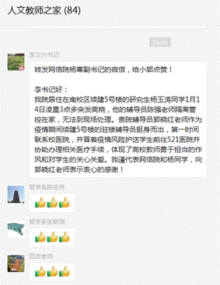 事后,生病学生所在的网信院党委副书记和海棠5号楼责任副书记均第一时间与永利集团88304党委书记联系,表达学生及学院、书院的感谢之情。网信院杨寒副书记说道,郭晓红在紧急状况时挺身而出,冒着疫情风险护送学生前往医院并协助办理相关手续,体现了一名共产党员勇于担当的作风和高校教师对学生的无私关爱。永利集团88304的老师也纷纷为郭晓红的事迹点赞,表示会以她为先锋榜样,以实际行动关心关爱学生,践行“立德树人”根本任务。