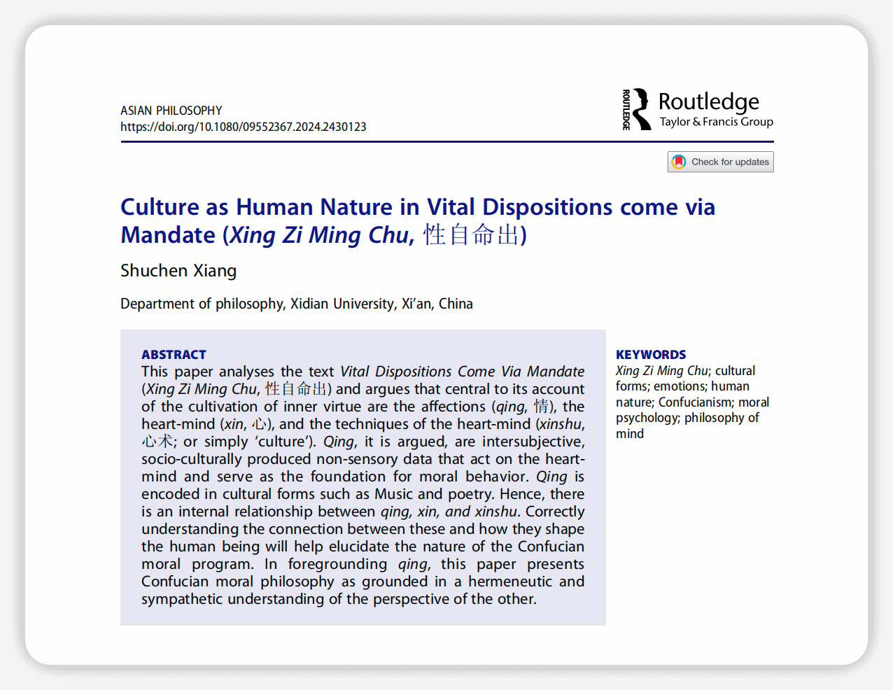 (通讯员 张万强)近日,东方哲学研究著名国际期刊Asian Philosophy上发表了永利集团88304项舒晨教授的论文“Culture as Human Nature in Vital Dispositions come via Mandate (Xing Zi Ming Chu, 性自命出)”(《“性自命出”中的人性论:文化即人性》)。