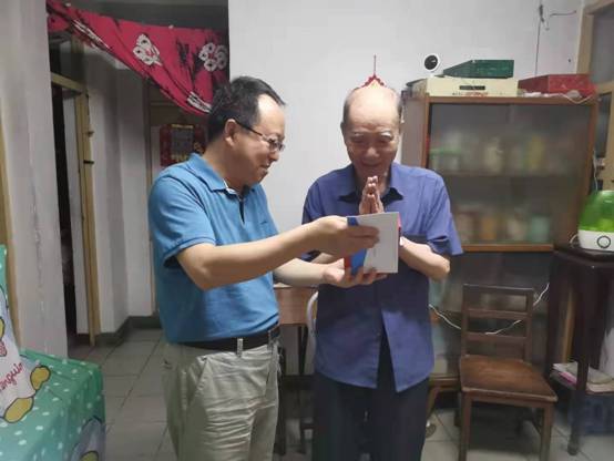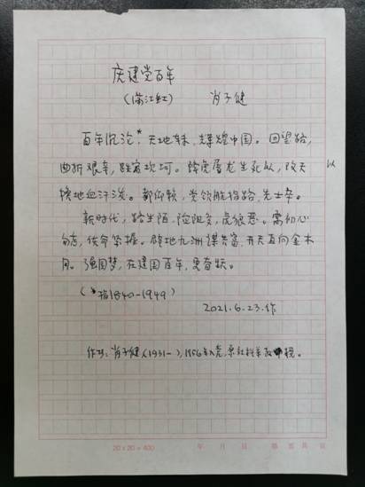 走访过程中,90岁高龄、党龄65年的肖子健老师向党委提交了他为建党百年亲笔书写的一首《满江红》并现场朗读,肖老师饱含深情的语言展现了一名老党员对党和国家的拳拳之心,也生动体现了党和国家百年来的风云变化。通过走访,党委一行人被各位老党员、老教授、老领导们的爱党爱国热情深深触动,愈发坚定了“听党话,跟党走”的决心与信心。