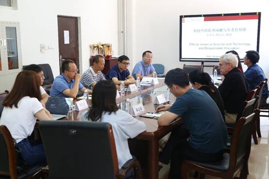 签约完成后,安东尼教授就《科技中的伦理问题与负责任创新》进行了专题介绍。首先表达了科学技术相关的伦理问题在未来社会发展中的重要性,他认为思考科学技术中的伦理问题并在社会中实际操作是解决科学技术在社会中引发的一系列问题的唯一途径。同时,安东尼教授对未来西电与巴斯克大学米盖尔·桑切斯·马扎斯中心之间的学术合作领域做了三个方面预想:第一个合作领域是学习和教学,根据合约双方可以相互交换教职人员在科学技术伦理、语言哲学、科学技术与公共政策等方面进行访问学术交流。第二个合作领域是合作性研究,双方可以合作在科学技术伦理、负责任创新等广泛的科学哲学研究领域。第三个合作领域是关于研究机构对社会干预性方面的研究。安东尼教授认为在哲学研究之中,我们不仅仅要关注文献,还应该思考一些社会实际问题,促进社会良性发展,促进科学技术负责任地引领创新。