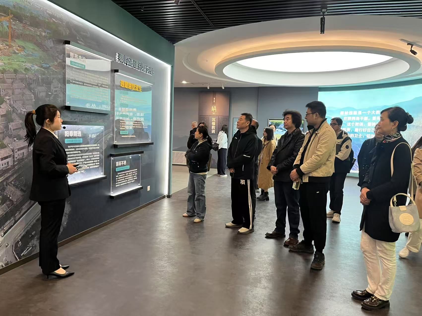 在基地讲解员的引领下,学院师生依次参观了“党的纪律建设历程”“以案为鉴 警钟长鸣”“新时代廉洁文化实践”等主题展区。通过图文展板、影像资料、情景模拟和互动体验等多种形式,系统学习了党的纪律建设的历史脉络,剖析了违纪违法典型案例,深刻体会了廉洁文化的精神内涵。展览以习近平总书记关于党风廉政建设和反腐败斗争的重要论述为主线,以“弘扬延安精神、净化政治生态”为主题,突出秦岭违建事件以案促改等内容。展区内详实的案例剖析与生动的警示教育场景,为全体人员带来了一堂直击心灵的廉政党课,使大家在身临其境中接受党史教育、纪律教育及警示教育,牢记前车之鉴、守好底线。