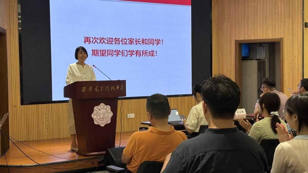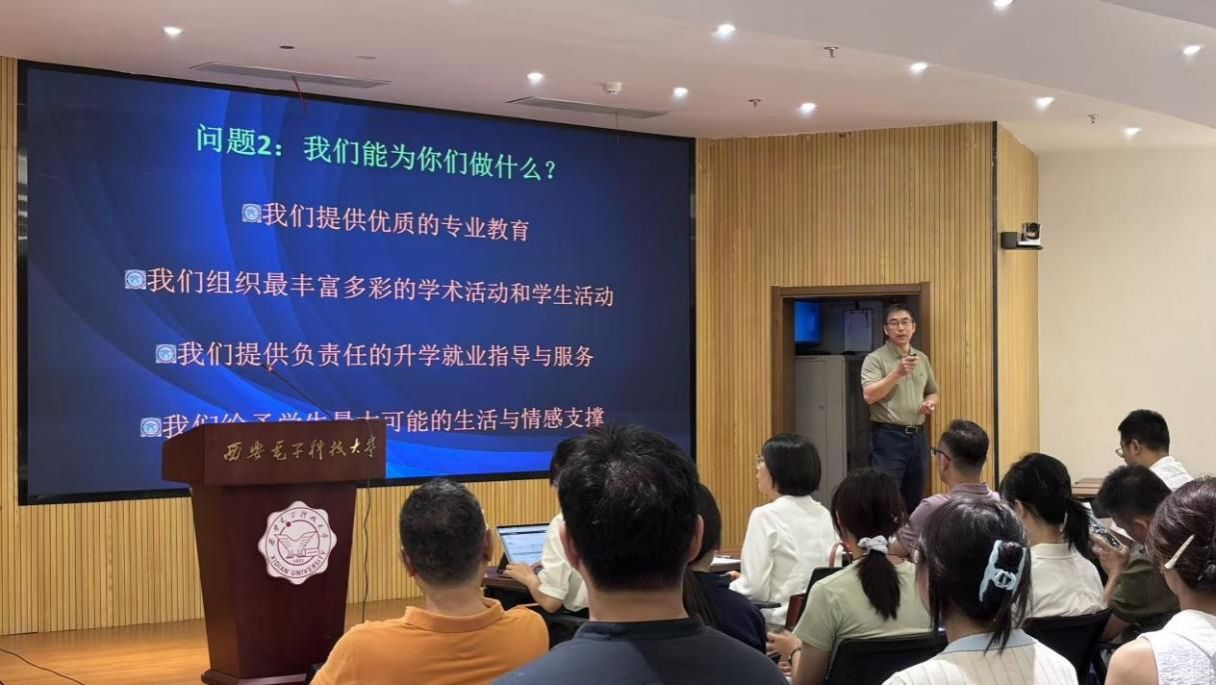 党委书记刘文博向新生代表赠送书籍《信仰的光芒——毛泽东与永利集团》,勉励他们从中汲取历史智慧和思想力量,传承西电精神。院长石福祁以“放手”和“放心”为关键词,回答了学生和家长们最关心的“我们是谁”“我们能为你们做什么”“我们对你们有什么建议”等三个问题,整体介绍了学院师资队伍、教育教学、品牌活动和就业指导与服务,他希望同学们在大学期间树立正确的专业观,规划好自己的人生道路,全心投入大学生活、精益求精。最后他强调了家校合作的重要性,呼吁家长“放手”与“放心”,让学生自主探索。
