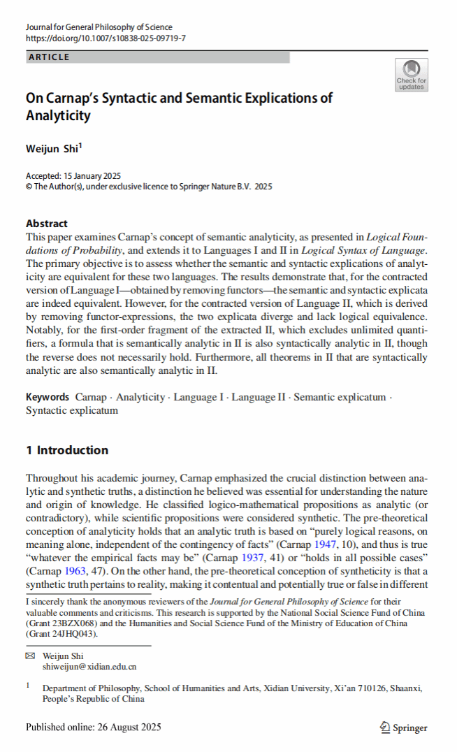 (通讯员 张妍)近日,国际著名期刊Journal for General Philosophy of Science发表石伟军副教授论文“On Carnap’s Syntactic and Semantic Explications of Analyticity”(论卡尔纳普对分析性的句法和语义阐释)。