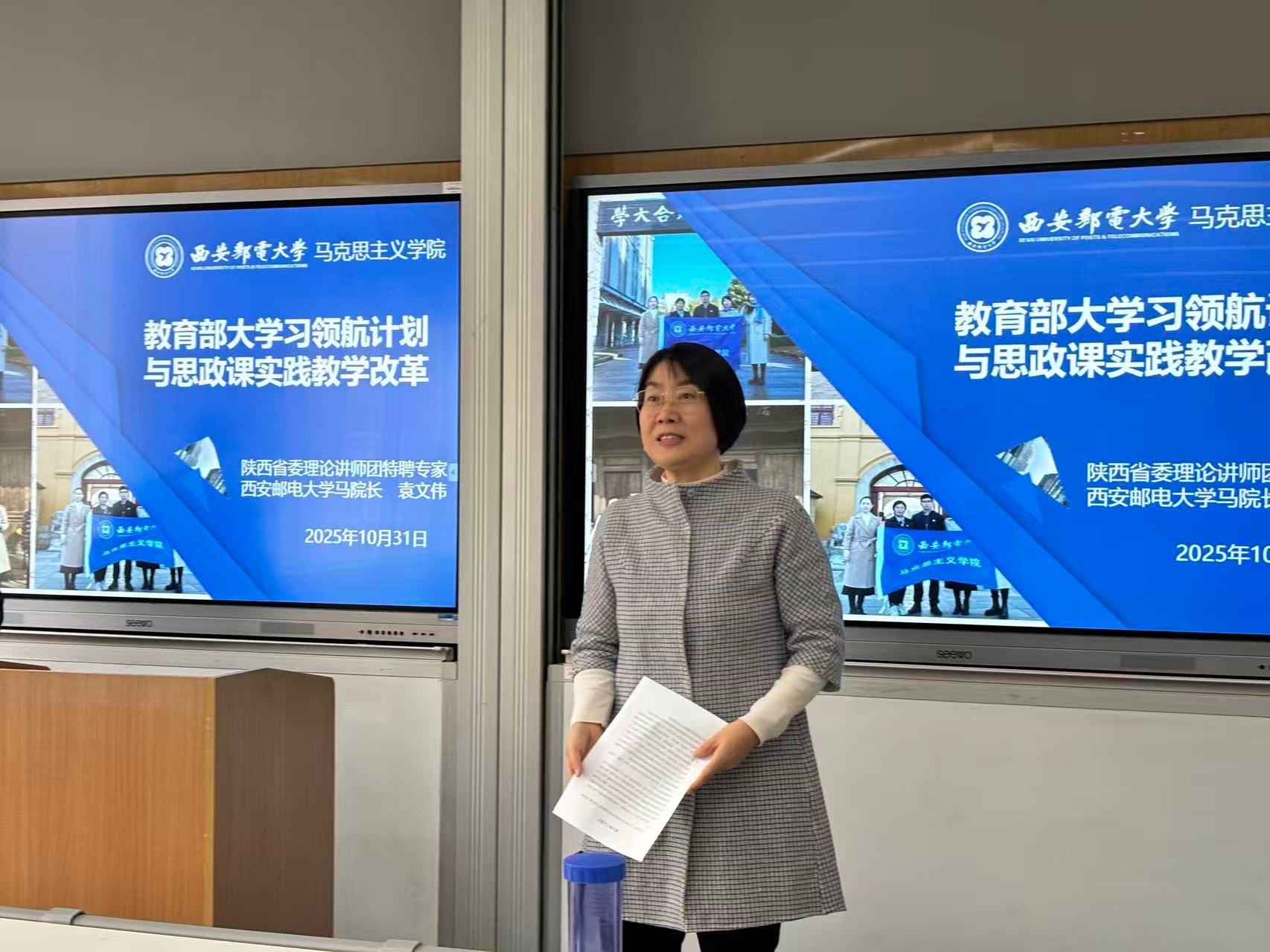 袁文伟教授以教育部“习近平新时代中国特色社会主义思想大学习领航计划系列主题活动”的理念与内容为导入,强调思政课不应停留在书本和课堂,而应通过艺术展、公开课、微电影、夏令营等形式,将教改融入学生成长中,以增强学生学习的主动性、积极性与获得感。他以西安邮电大学“微电影+思政”实践为例,讲述了学生前往红光沟航天精神教育基地、陕西延安、新疆塔里木大学等地拍摄思政课微电影的真实故事,以及由此诞生了《如愿》《我的托克拉克》《代号067—矢志不渝,筑梦九天》等优秀作品。培训结束后,袁文伟教授与前来的青年教师们展开了友好的交流互动。