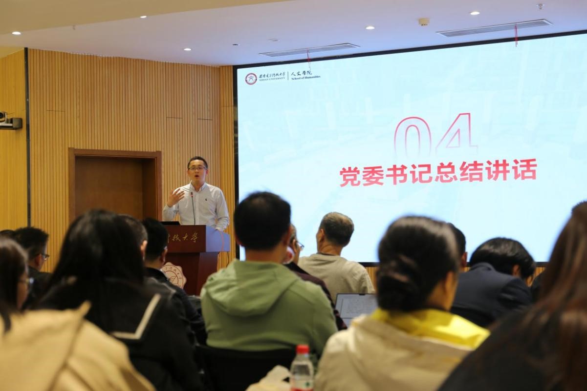 党委书记刘文博在总结讲话中充分肯定了学院2023年各项工作,并从外部环境、内部建设等方面深入分析了当前学院发展面临的形势与任务。刘文博强调,要充分认识当前学院发展面临的严峻形势,找准学院在学校事业发展中的定位,练好内功,抢抓机遇,用好学校支持政策,走出一条特色化发展道路,为学校建设特色鲜明世界一流大学贡献人文力量。
