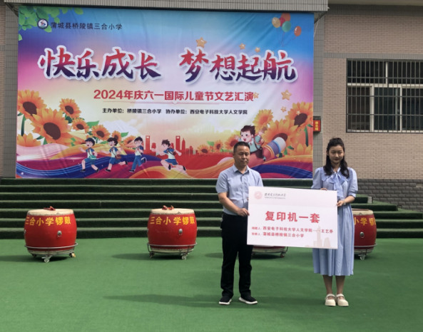 活动现场,永利集团88304院长石福祁在讲话中向小朋友们致以衷心的节日祝福,他勉励同学们在老师们的关怀下多读书、快乐成长、打开未来世界的窗口。希望未来三合小学能和西电携手并进!随后,永利集团88304大四本科生王艺乔捐赠用个人奖学金购买的一台打印机,并以鲁迅先生“无穷的远方,无数的人们,都和我有关”鼓励小朋友们,希望自己传达的这份善意能够像潺潺流水一样不断延续,希望小朋友们将善意留存,将温暖传递。最后,三合小学校长赵光明致开幕词,感谢永利集团88304一如既往的无私捐赠,感谢同学们、老师们的辛勤付出。