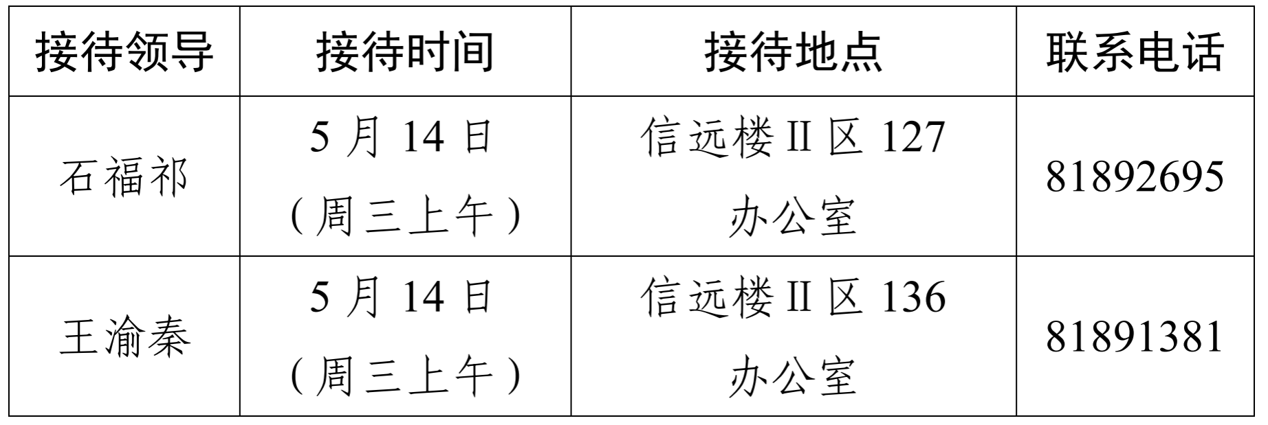 注:学院领导班子接待日主要受理的事项:1.学院人才培养、教学科研、学科建设、教师发展、对外交流、学生管理和服务保障等方面存在的问题与建议;2.反映有关学院重要决策和重要工作事宜的问题;3.涉及师生员工利益的申诉和诉求;4.亟须学院处理的难点问题;5.其他方面的建议和意见。