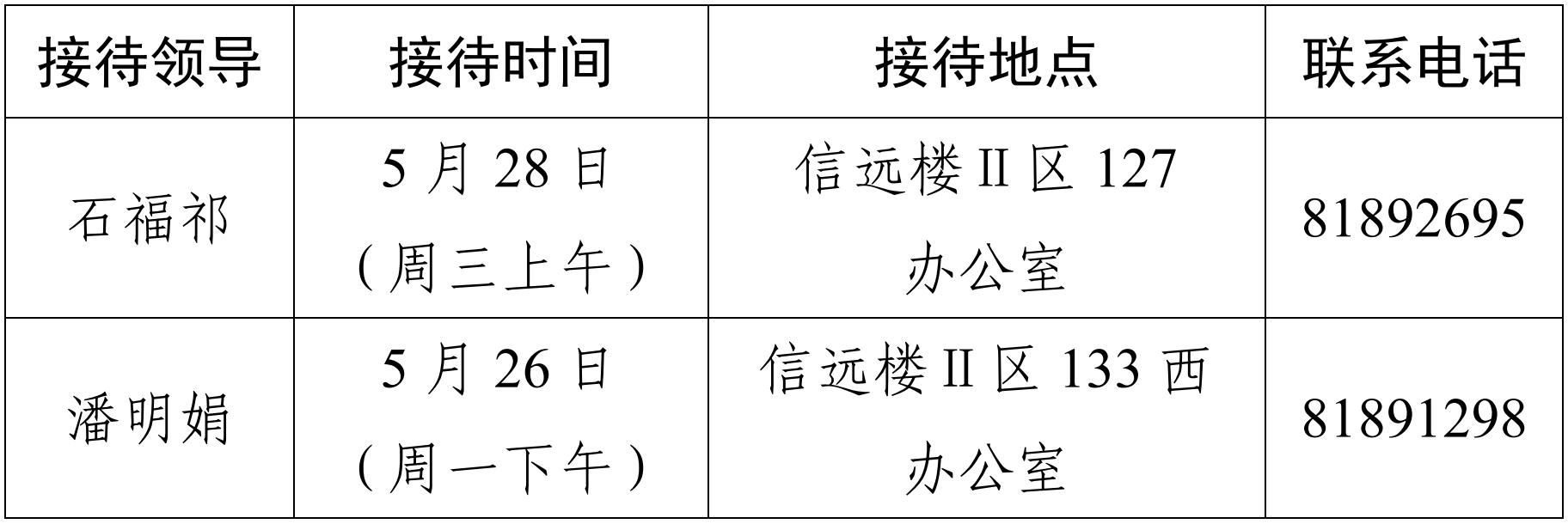 注:学院领导班子接待日主要受理的事项:1.学院人才培养、教学科研、学科建设、教师发展、对外交流、学生管理和服务保障等方面存在的问题与建议;2.反映有关学院重要决策和重要工作事宜的问题;3.涉及师生员工利益的申诉和诉求;4.亟须学院处理的难点问题;5.其他方面的建议和意见。