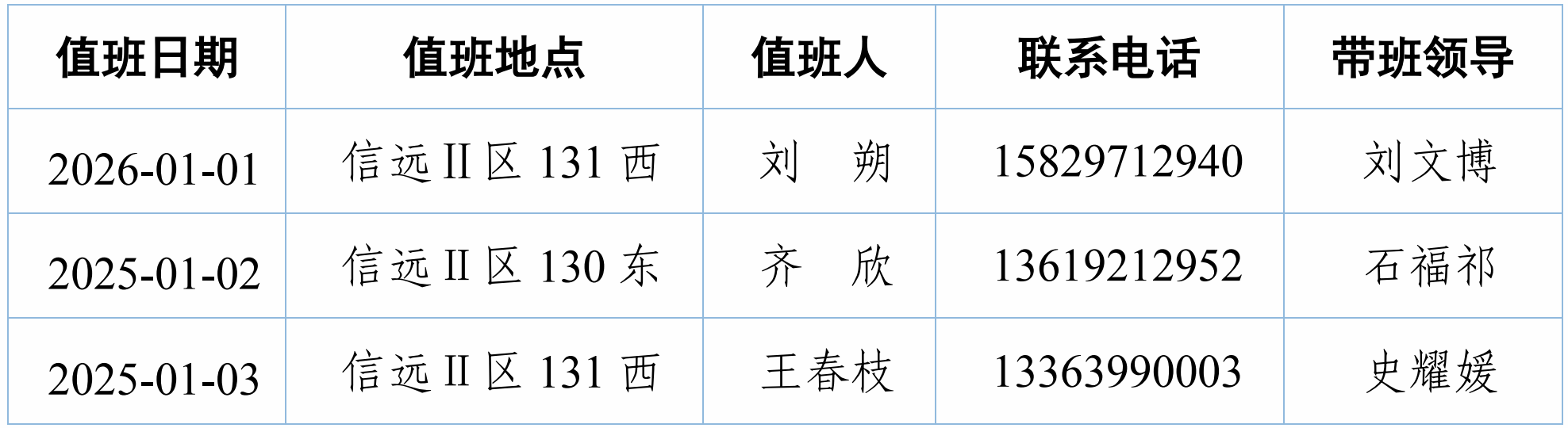 注:1.值班时间:上午8:30--11:30,下午14:30--17:30;2.值班人员24小时保持联系通畅。
