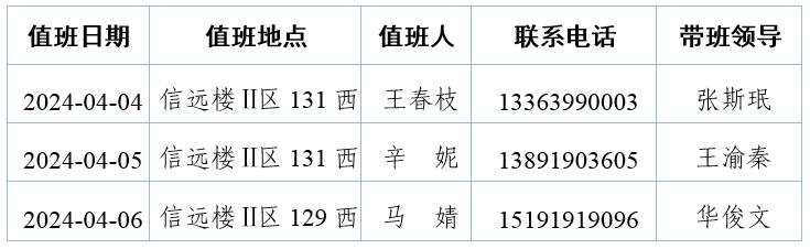 按照学校《关于2024年清明节放假时间安排的通知》要求,现将学院2024年清明节假期值班安排如下: