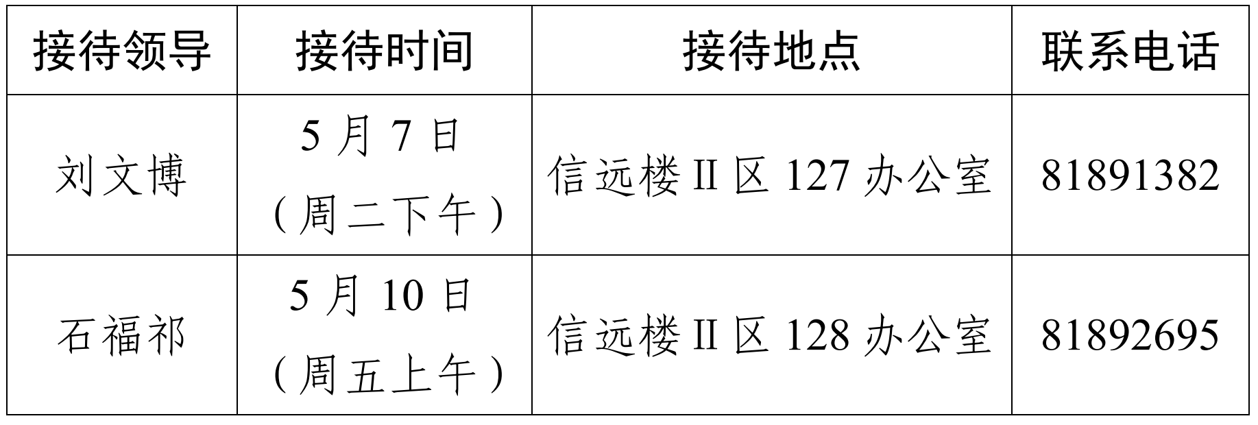 注:学院领导班子接待日主要受理的事项:1.学院人才培养、教学科研、学科建设、教师发展、对外交流、学生管理和服务保障等方面存在的问题与建议;2.反映有关学院重要决策和重要工作事宜的问题;3.涉及师生员工利益的申诉和诉求;4.亟须学院处理的难点问题;5.其他方面的建议和意见。