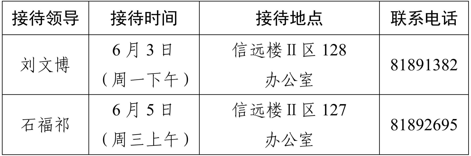 注:学院领导班子接待日主要受理的事项:1.学院人才培养、教学科研、学科建设、教师发展、对外交流、学生管理和服务保障等方面存在的问题与建议;2.反映有关学院重要决策和重要工作事宜的问题;3.涉及师生员工利益的申诉和诉求;4.亟须学院处理的难点问题;5.其他方面的建议和意见。