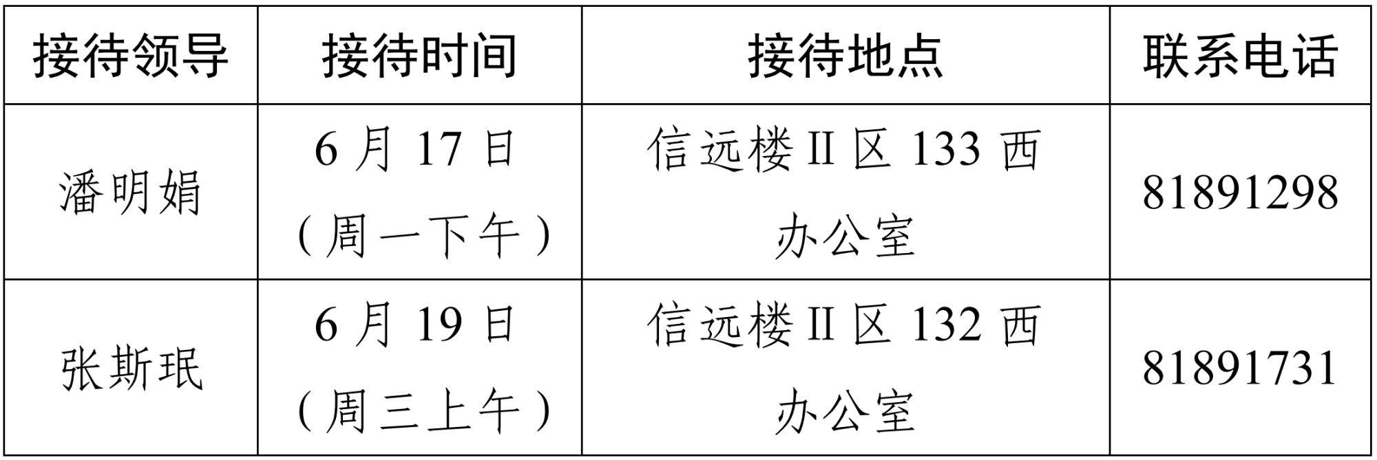 注:学院领导班子接待日主要受理的事项:1.学院人才培养、教学科研、学科建设、教师发展、对外交流、学生管理和服务保障等方面存在的问题与建议;2.反映有关学院重要决策和重要工作事宜的问题;3.涉及师生员工利益的申诉和诉求;4.亟须学院处理的难点问题;5.其他方面的建议和意见。