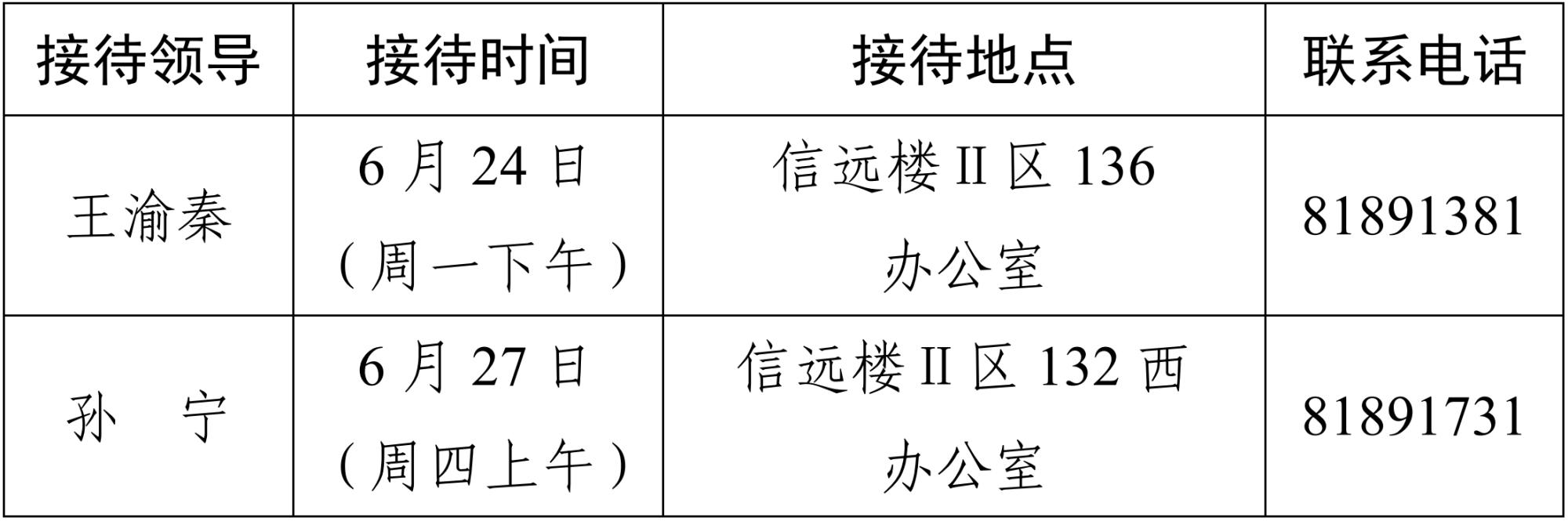 注:学院领导班子接待日主要受理的事项:1.学院人才培养、教学科研、学科建设、教师发展、对外交流、学生管理和服务保障等方面存在的问题与建议;2.反映有关学院重要决策和重要工作事宜的问题;3.涉及师生员工利益的申诉和诉求;4.亟须学院处理的难点问题;5.其他方面的建议和意见。