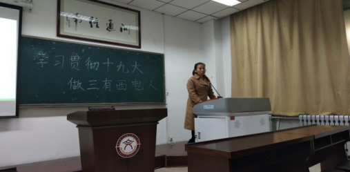 首先辅导员郭雨晴对大家提出几点希望:希望大家认真学习十九大精神,提高自身素质。希望大家重新审视自己,坚定理想。希望大家踊跃发言,认真思考,有所感,有所行。