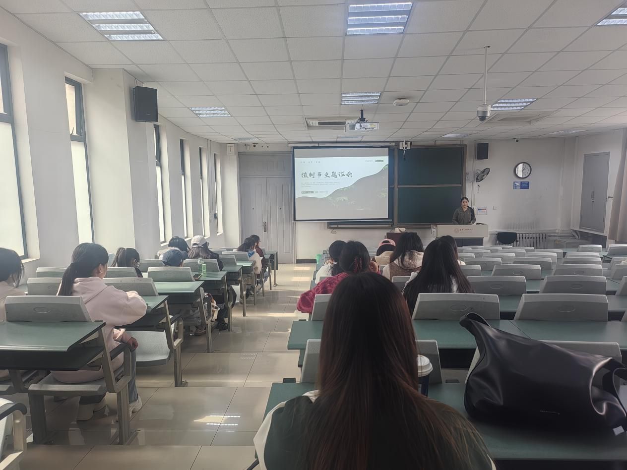 本次活动涵盖理论学习与实践体验两个部分。在理论学习环节,班主任刘茸茸强调:“新时代青年必须牢固树立生态价值观,以实际行动践行生态文明建设。”辅导员郭晓红通过“塞罕坝三代人治沙”“蚂蚁森林全民种树”等鲜活案例,生动诠释了“绿水青山就是金山银山”的深刻内涵。学生李含一结合纪录片《绿色中国梦》,讲述了我国植树节的由来和植树造林的重要意义,展现了中国治理荒漠化的决心与效率。理论学习后,在班主任和辅导员的带领下,同学们前往南操场西侧进行植树活动,让防治荒漠化的理论认知转化为扶苗培土的实际行动,在汗水中深化了对生态文明建设“知行合一”的理解。