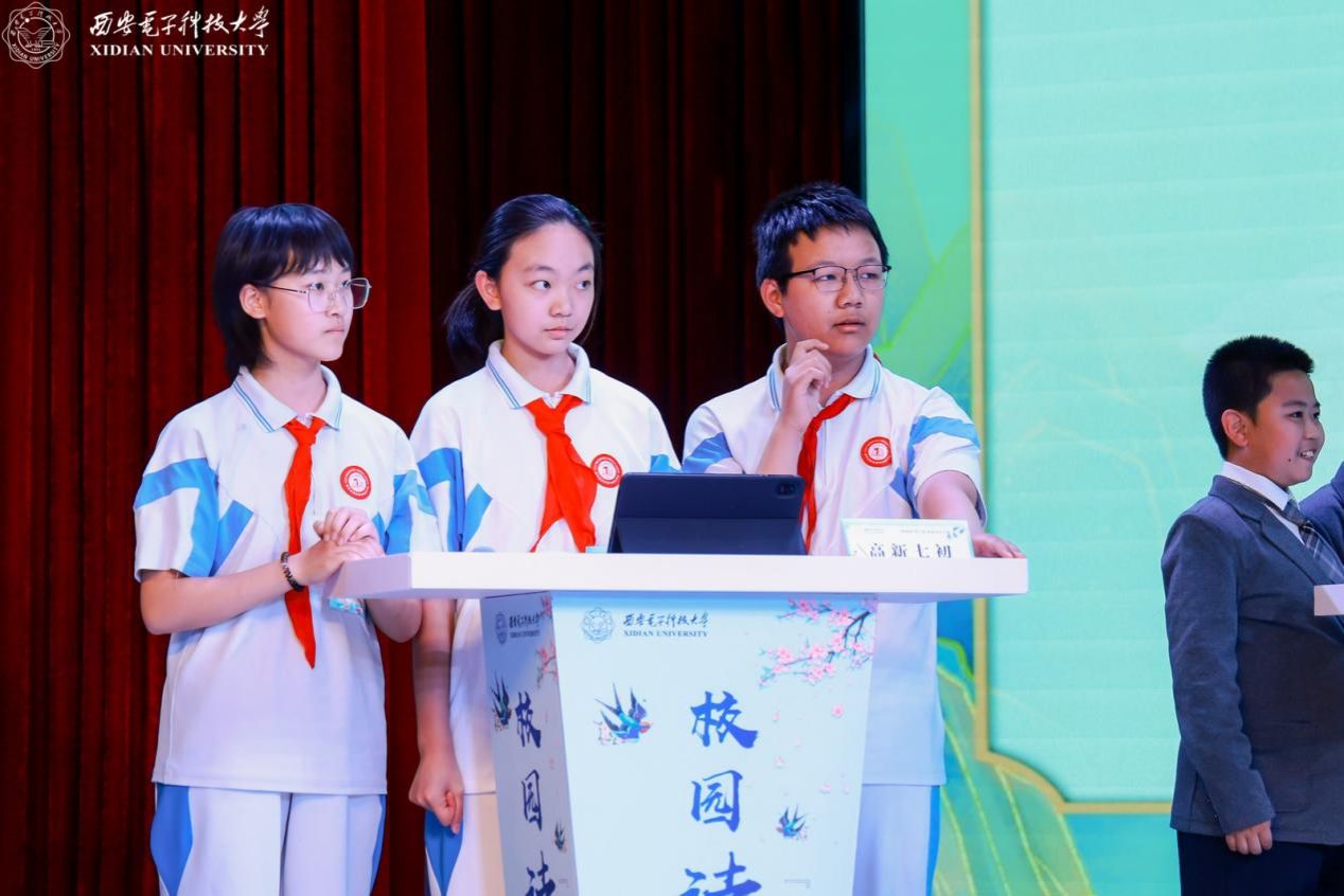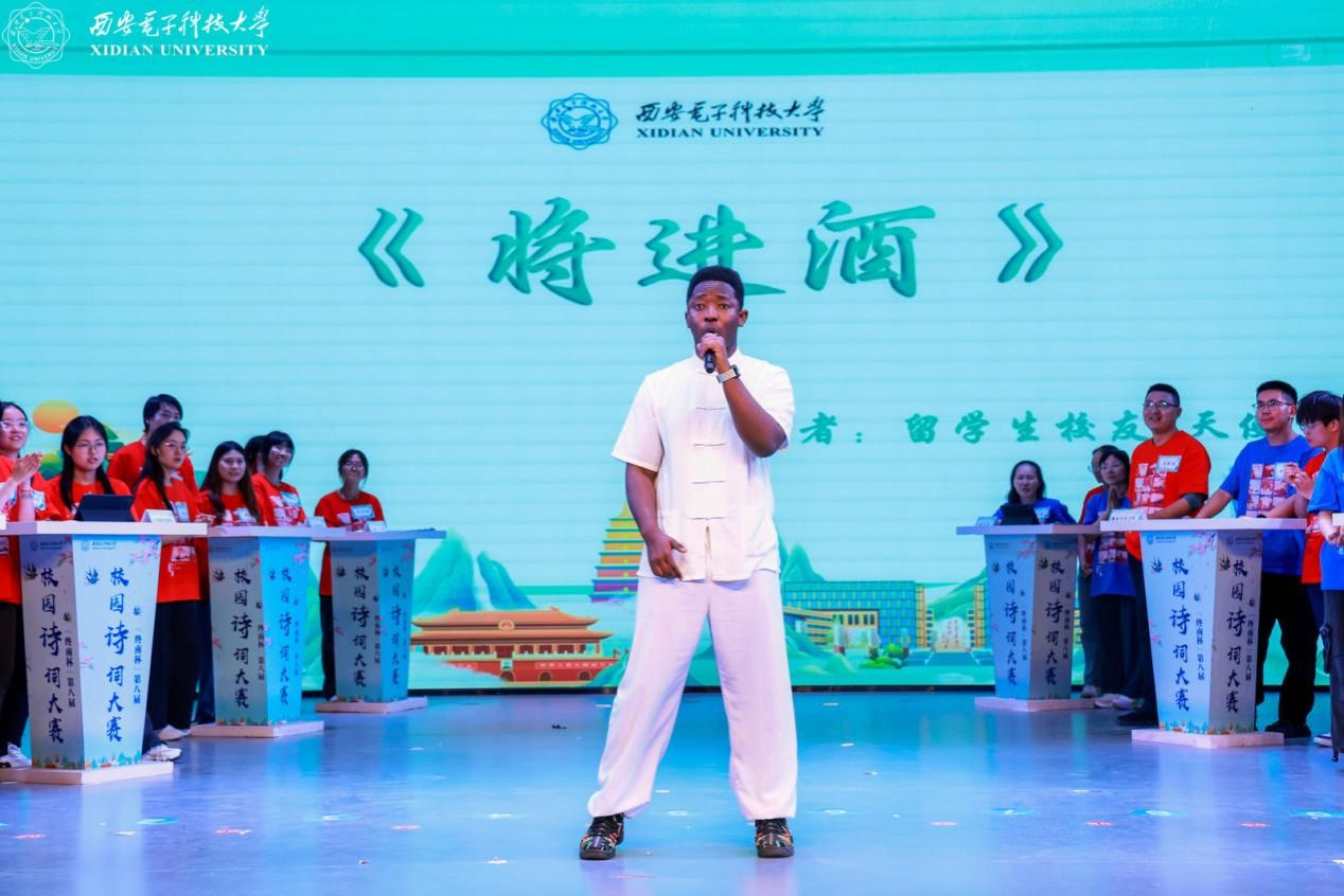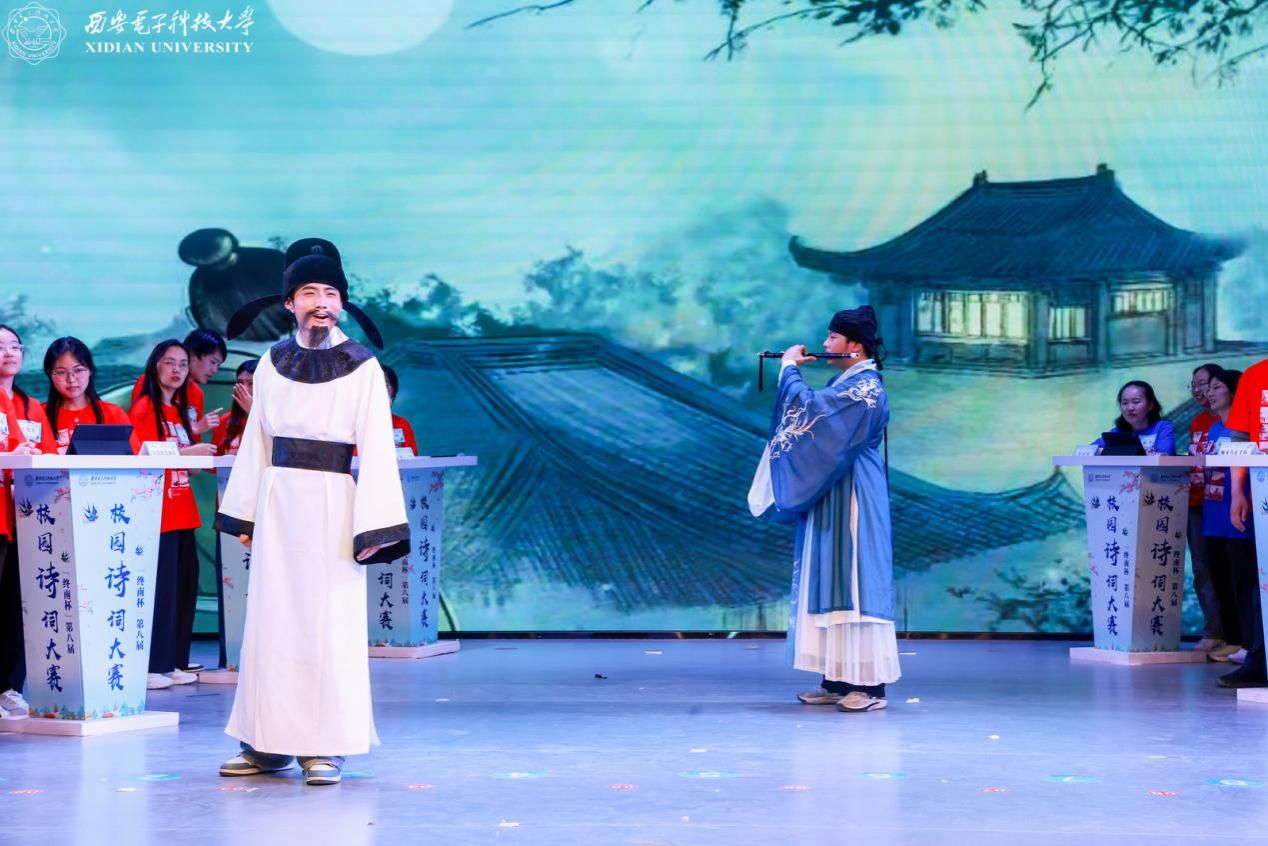 为丰富和活跃大赛氛围,大赛特安排暖场环节。“时代之声”研究生宣讲团以“AI视频+真人现场”的创新形式诵读《数智华彩·长安胜迹吟》原创作品,展示数字赋能下千年遗迹的生机与活力;西安高新区第八初级中学合唱团表演的合唱《声声慢》余音绕梁;西安市高新区第五初级中学舞蹈团表演的舞蹈《十八焕珠》翩跹灵动,共同烘托出决赛现场的诗韵氛围。除此之外,活动特别邀请到留学生校友天使进行现场互动,并表演吟诵李白的《将进酒》,创新性融入抑扬顿挫的陕西方言,全场观众在这跨越千年的激昂韵律之中,感受诗仙的洒脱不羁以及中华传统文化的深厚韵味。
