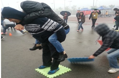 运动会在组队形式上倡导院际合作,四个学院分散组合了13支代表队;在项目设计上注重团队效能,设计了摸石头过河、踩气球、五人六足、螃蟹背西瓜、晕头转向、纸杯传水和动力火车等七个深受广大同学喜爱的项目。
