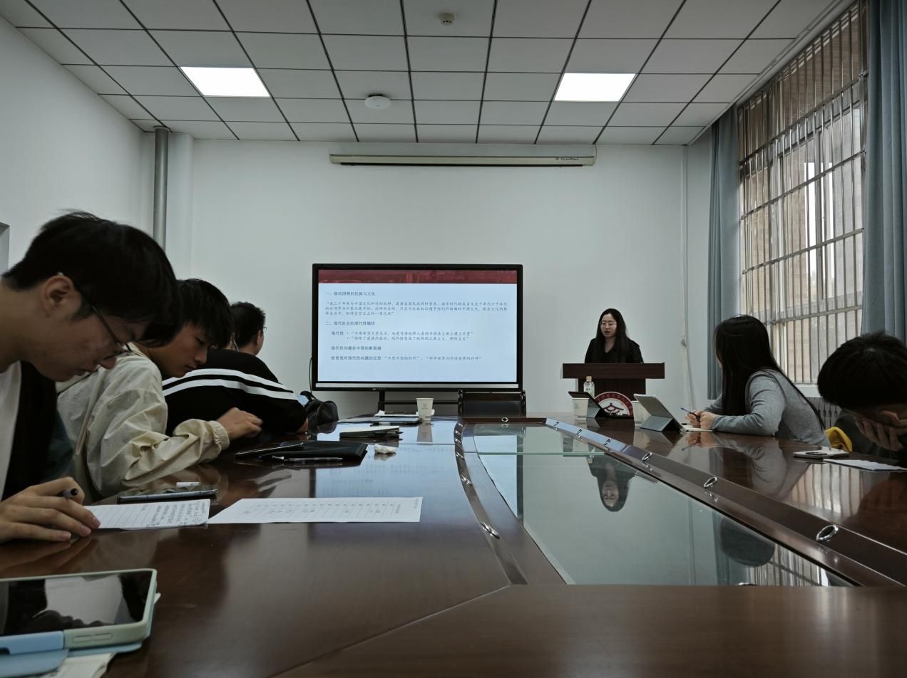 车昱霖以“欧阳德良知思想研究”为主题进行汇报,从欧阳德简介、思想渊源、思想继承三个方面展开探讨。首先,车昱霖以“器宇温粹,学务实践,不尚虚空”十二字概括了欧阳德先生的美好品质。随后她阐述了欧阳德先生在面对知行困扰,无法内求于己的难题时,与同门龙溪的切磋研讨使其有了新的领悟,即“阳明之学益以大振于时,南野先生之力也。”最后她就欧阳德“良知”之困,对良知的基本概念进行了阐释,将其与王阳明的“体认良知”相联系,最后跟随良知的发用路径上升到本体论的层面。